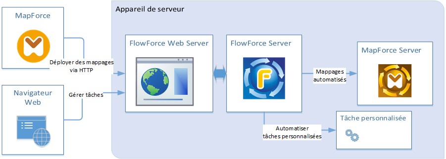 •Sur l'appareil Windows sur lequel MapForce est exécuté, déployer le mappage vers un appareil à serveur où MapForce Server et FlowForce Server sont installés. L'appareil du serveur peut être un système d'exploitation différent (voir Exigences du système). Les mappages déployés de cette manière deviennent des fonctions FlowForce Server et ils vous permettent de créer des tâches programmées ou basées sur des déclencheurs. Lorsque des mappages sont exécutés en tant que tâches FlowForce Server, ils peuvent aussi être exposés en tant que services Web, enchaînés en tant que sous-étapes d'autres tâches, ou deviennent une partie des flux de travail, ce qui inclut l'envoi d'e-mails, la vérification de codes de sortie, l'exécution de commandes shell, etc.