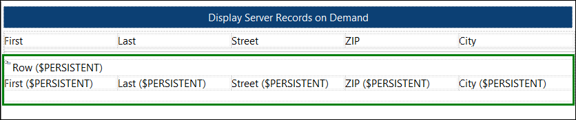 Veuillez noter que dans les captures d'écran des designs, les cellules de la table dans 02-DisplayRecords.mtd (2) sont liées à la source de page $DB1 (capture d'écran ci-dessous à gauche), alors que les cellules de la table dans 03-DisplayOnDemand.mtd (3) sont liées à la source de page $PERSISTENT (capture d'écran ci-dessous à gauche). Ces sources de page - $DB1 (la source de page liée à la base de données sur le serveur) et $PERSISTENT (la source de page sur le client) - font que les données des sources de page respectives sont affichées dans la table.