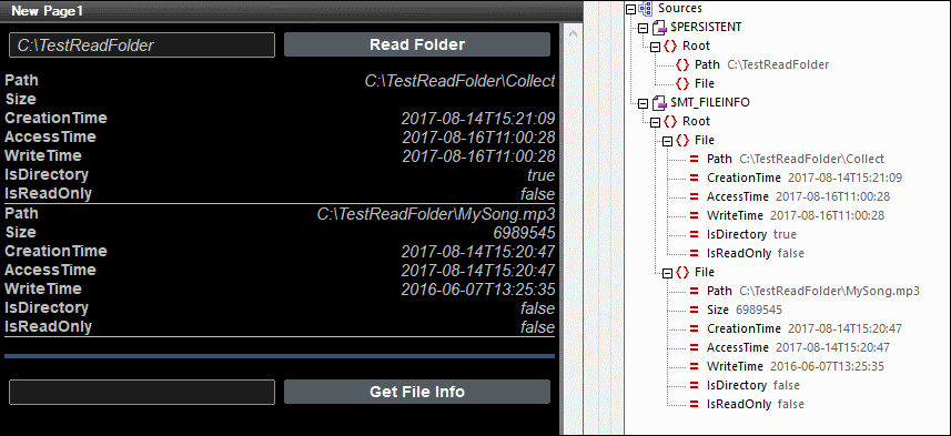 •La source de page $MT_FILEINFO est aussi peuplée avec des données obtenues par l'action Obtenir info de fichier. Alors que les données lues par l'action Lire dossier sont transférées aux éléments enfant File de $MT_FILEINFO/Root, les données lues par l'action Obtenir info de fichier sont transférées aux attributs de $MT_FILEINFO/Root .