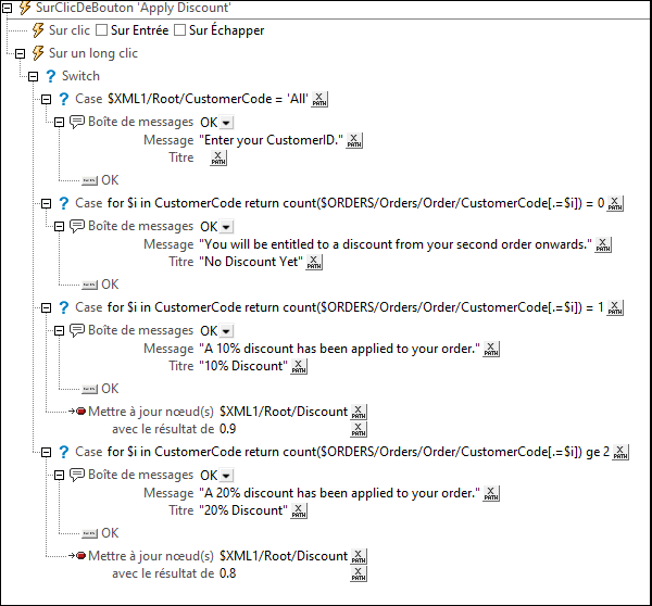 Chaque action Case a un ensemble d’actions appropriées définies à l’intérieur. Par exemple : La première action Case couvre la situation dans notre solution hypothétique dans laquelle aucun code client n’a été saisi. La deuxième action définit les actions à réaliser quand aucune autre commande n’existe dans la base de données pour le client actuel (dans ce cas, aucune réduction n’est appliquée). Les troisième et quatrième actions Case définissent les actions à réaliser dans le cas où le client actuel a, respectivement, une commande précédente et deux ou plus de commandes précédentes dans la base de données ; différentes réductions sont appliquées dans chaque cas (10 % et 20 %, respectivement).