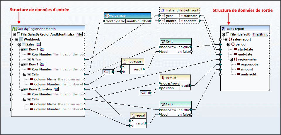 •The names of the input and output components that you want to use. (In the design shown above, these are, respectively, SalesByRegionAndMonth and sales-report.) Note that you can specify multiple input and output components. If, in the design, multiple input components are required to generate one output data structure, then they must all be supplied as (input and output) parameters to the MapForce Transfer action.