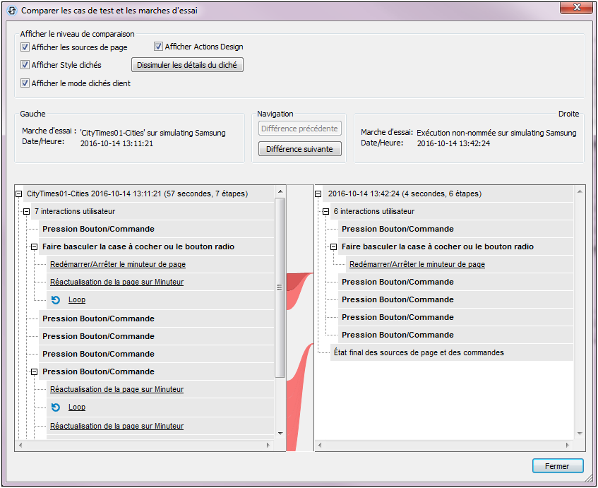 Dans le dialogue Comparer les cas de test et les marches d'essai, vous pouvez :