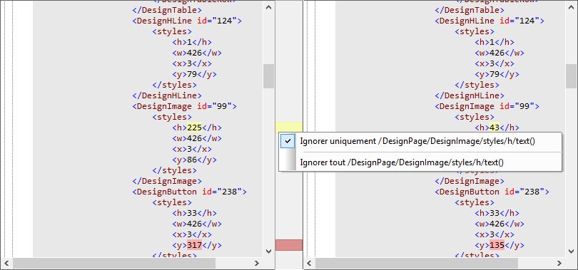 •Ignorer la source de page spécifiée ou les nœuds de données de cliché pour les différences. Dans la colonne entre les deux volets, cliquer avec la touche de droite sur un connecteur de différence et choisir Ignorer uniquement <ce nœud> ou Ignorer tous <ces nœuds> (voir capture d'écran ci-dessous). Les nœuds ignorés sont marqués en jaune. Ces nœuds seront ignorés en tant que différences dans les lectures suivantes. Pour consulter à nouveau les différences dans ces nœuds, désélectionner Ignorer uniquement <ce nœud> ou Ignorer tous <ces nœuds>.
