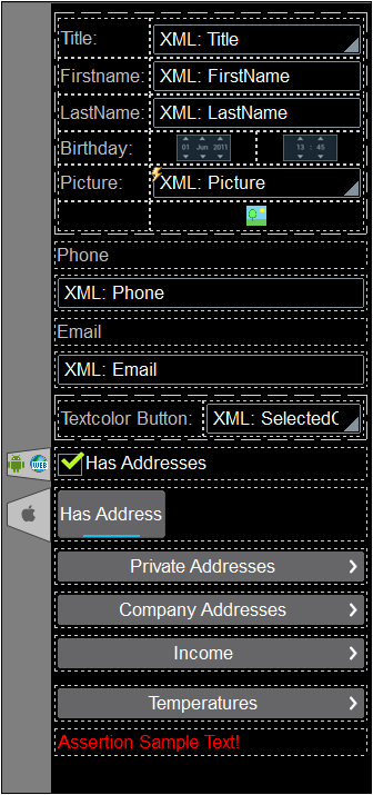 Affiche le dialogue de Visibilité dépendant de l'appareil (capture d'écran ci-dessous). Le dialogue contient une liste des types d'appareils client. Sélectionne le type d'appareil client pour lequel vous souhaitez obtenir la visibilité de la commande puis cliquez OK. Si ce type d'appareil client est doté d'une icône, celle-ci apparaît dans le design, à la gauche de la commande à laquelle elle s'applique (voir capture d'écran ci-dessous). |