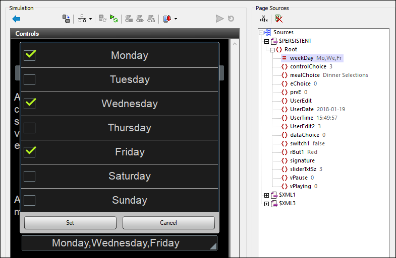 Dans la capture d'écran ci-dessous, les valeurs correspondant aux options sélectionnées sont concaténées dans un seul string (avec des séparateurs virgules) et saisies dans le nœud d'attribut weekDay. Le séparateur aurait été sélectionné par le biais de la propriété Multi Select Separator (voir ci-dessous).
