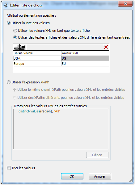Note : L'utilisation des expressions XPath vous permet de générer des entrées et des valeurs de données XML dynamiquement. Par exemple, l'expression distinct-values(region), "All" génère une séquence, dont les items sont les valeurs distinctes différentes de l'élément region, plus un item final, All.