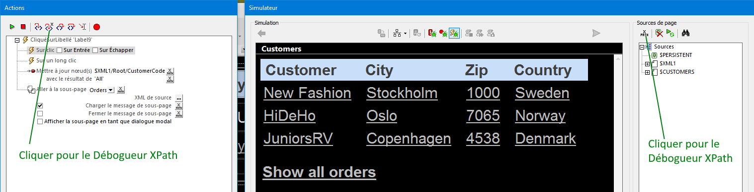 3.Lors de l’exécution d’une simulation: Dans le Débogueur d’Actions, cliquer sur la touche Pas à pas dans XPath pour déboguer l’expression XPath de l’action actuelle par rapport aux sources de la page de l’action (voir capture d'écran ci-dessous.).