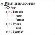Le nœud Root de la source de page $MT_ZEBRASCANNER a un élément enfant supplémentaire - dénommé Image. Si une action Configurer du scanneur Zebra a son option Set Scanner Mode définie comme Image, alors l’image code-barres est scannée et stockée sous le format Base64 dans l’attribut de la source de page Image/@data.