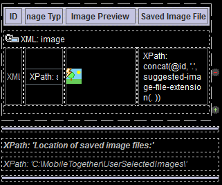 Le fichier d'exemple UserSelectedImages.mtd a un design qui permet à l'utilisateur final de choisir une image depuis une galerie sur l'appareil mobile. Cette image est enregistrée automatiquement sous un nœud XML dans la source de données en tant que string encodé en Base64. L'image encodée en Base64 est ensuite enregistrée automatiquement en tant que fichier d'image sur un emplacement choisi par le designer (et défini dans le design).