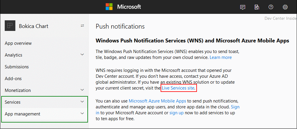 3.Aller à la page de votre appli, et sélectionner Services > Push notifications > WNS/MPNS. Dans certains cas, l'item WNS/MPNS est listé sous App management (voir capture d'écran ci-dessous)
