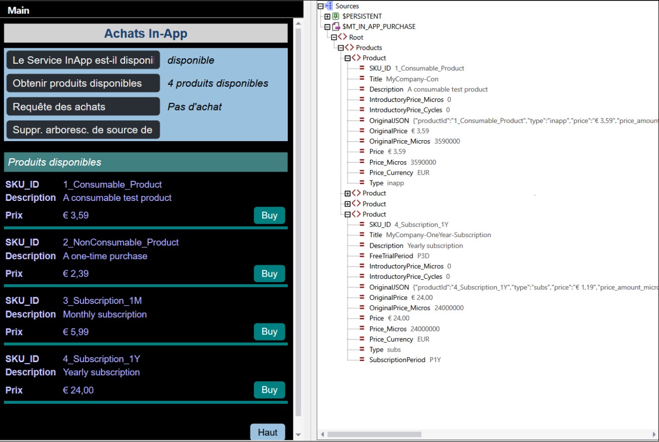 Après avoir interrogé les produits, l'app store renvoie les données sur les produits interrogés au client et ces données sont stockées dans la source de page $MT_IN-APP_PURCHASE (voir Requête des produits disponibles pour les détails). Les actions qui envoient la requête et stockent les données sont exécutées automatiquement par MobileTogether.