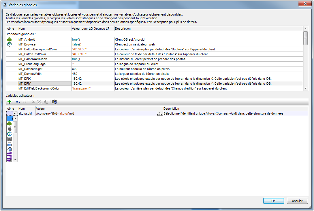 •Variables de valeur statiques (appelée Variables globales dans le dialogue) : ces variables contiennent des informations concernant l'appareil mobile. Les valeurs de ces variables ne changent pas pendant l'exécution du projet. Veuillez noter que la colonne Valeur dans le volet supérieur spécifie l'appareil mobile actuellement sélectionné. Les valeurs recensées pour cet appareil en particulier. Pour les simulations, l'appareil client est considéré être l'appareil sélectionné dans la liste de choix du sélecteur d'appareil. Par exemple, la variable $MT_Android a une valeur true lorsque l'appareil mobile utilisé est un Android. (Les informations relatives aux appareils sont envoyées par l'appareil en tant que partie intégrante des procédures de communication mobiles standard.) •Variables de valeur dynamique (appelées Variables locales dans le dialogue) : ces variables contiennent des informations concernant la page de design et ses commandes. Leurs valeurs peuvent changer pendant l'exécution. Par exemple, la variable $MT_ControlNode a des valeurs différentes dépendant du nœud qui est le lien de source de page de la commande actuelle à un moment donné pendant l'exécution du projet. •Variables utilisateur : outre la bibliothèque standard des variables globales, vous pouvez ajouter vos propres variables globales (appelées Variables utilisateur dans le dialogue) dans le volet inférieur du dialogue. Vous pouvez donner n'importe quelle valeur à une variable utilisateur et cette valeur peut ensuite être utilisée dans n'importe quelle expression XPath/XQuery dans le projet.