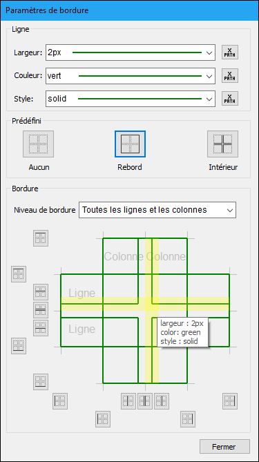 •Une fois qu'un style a été appliqué à une bordure et que vous déplacez la souris sur la bordure, outre le fait qu'elle passe au jaune, les propriétés de la bordure sont affichées dans une fenêtre popup (capture d'écran ci-dessus).