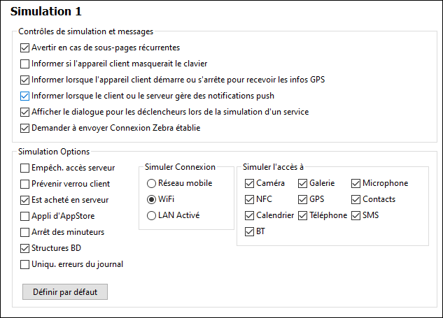 •Options : Les paramètres que vous effectuez ici déterminent les paramètres du simulateur. Par exemple, vous pouvez définir si le simulateur a accès au serveur ou non et si un verrou client devrait être empêché. Vous pouvez spécifier si vous souhaitez simuler une connexion WiFi, LAN ou sur réseau mobile au démarrage du simulateur. Par défaut, l'option Simuler WiFi est allumée. (Dans le Simulateur, vous pouvez changer les options à tout moment.) Le bouton Configurer les défauts réactualise les options à leurs paramètres originaux par défaut. Vous pouvez aussi simuler que certaines applis du côté client (comme un appareil photo ou un calendrier) ou une fonction (telle que Bluetooth (BT)) peuvent être accédées. Une fois que le simulateur est démarré, vous pouvez modifier ces paramètres dans la barre d'outils du simulateur dans son menu Simulation. Pour définir les sources de données par défaut pour certaines de ces applis côté client simulées, rendez-vous dans l’onglet Simulation 2 de ce dialogue.