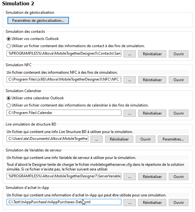 Dans l'onglet Simulation 2 (capture d'écran ci-dessous), vous pouvez spécifier les paramètres de simulation disponibles en option, en plus de ceux disponibles dans l'onglet Simulation 1 (voir le point précédent). Ces paramètres comprennent la définition des sources de données pour la simulation des applis du côté client.