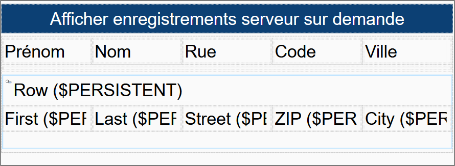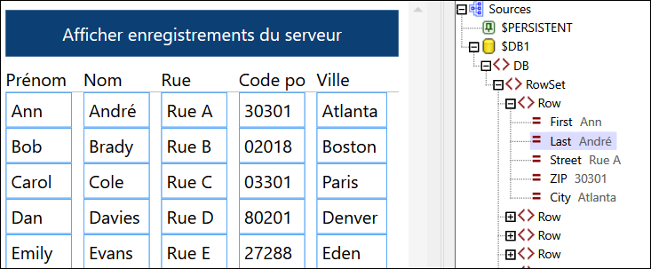 Veuillez noter que dans les captures d'écran des designs, les cellules de la table dans 02-DisplayRecords.mtd (2) sont liées à la source de page $DB1 (capture d'écran ci-dessous à gauche), alors que les cellules de la table dans 03-DisplayOnDemand.mtd (3) sont liées à la source de page $PERSISTENT (capture d'écran ci-dessous à gauche). Ces sources de page - $DB1 (la source de page liée à la base de données sur le serveur) et $PERSISTENT (la source de page sur le client) - font que les données des sources de page respectives sont affichées dans la table.