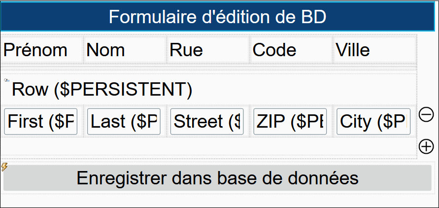 L'exemple de solution 04-EditRecords.mtd (design affiché dans la capture d'écran ci-dessous) affiche les données de BD dans la table et permet aux utilisateurs d'éditer les données. Les champs de la table sont liés à la source de page $PERSISTENT. Ceci signifie (i) que les contenus de $PERSISTENT sont affichés dans la table, et (ii) que les éditions que vous réalisez dans la table sont stockées dans $PERSISTENT.
