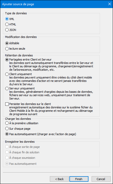 Cette option est activée sur la source de page est un fichier externe (XML, HTML ou DB). Elle permet de choisir si les données sont enregistrées au moment (i) de quitter la page, (ii) de quitter la solution complètement, (iii) où l'utilisateur clique sur la dernière option Soumettre, ou (iv) lorsque défini expressément en tant qu'action de page ou de commande. Voir Actions de source de page.