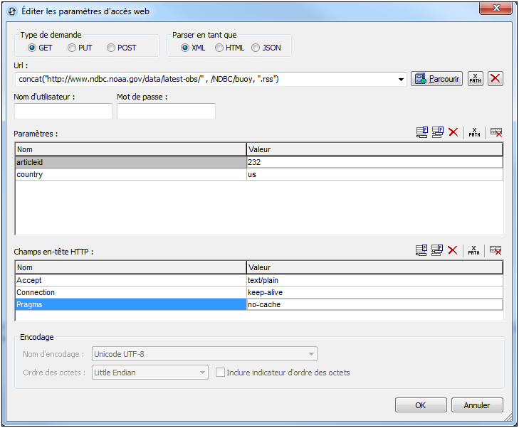 Les paramètres pour les requêtes HTTP/FTP sont définis dans le dialogue Éditer les paramètres de l'accès Web (capture d'écran ci-dessous). Saisir le type de requête, l'URL de la ressource cible, le format de données de la ressource cible (XML, HTML ou JSON), les informations d'authentification de l'utilisateur et, en option, les paramètres de requête et les en-têtes. Dans la capture d'écran ci-dessous, par exemple, la requête GET est composée en utilisant une expression XPath : Elle cible une page .rss page sur le site Internet http://www.ndbc.noaa.gov. Le nom de la page RSS est pris depuis le nœud /NDBC/buoy, et la page cible sera parsée en tant que XML. Les paramètres de requête et les en-têtes peuvent être ajoutés à la requête. En revanche, l'en-tête charset, est généré automatiquement par MobileTogether Designer et ne sera pas écrasé par un en-tête charset que vous saisissez dans ce dialogue.