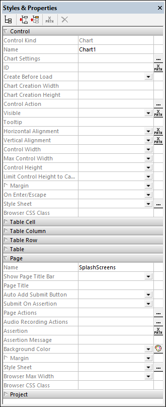 Tous les styles peuvent être définis dans le Volet Styles & Propriétés context-sensitive (voir la capture d’écran ci-dessous). Quand un contrôle est sélectionné dans le design, les propriétés de ce contrôle sont affichées au niveau supérieur du volet. Dans cet exemple de la capture ci-dessous, un Contrôle de Graphique a été sélectionné dans le design. Pour définir une valeur pour toute propriété de style du Graphique, sélectionnez depuis les valeurs disponibles ou saisissez la valeur que vous souhaitez, soit directement ou par le biais d’une expression XPath. Les propriétés de style de composants ancêtre sont affichées en-dessous du composant sélectionné — avec des ancêtres de niveau plus élevé étant affichés progressivement plus bas dans le volet. Par exemple, nous pouvons déduire de la capture d’écran ci-dessous que le contrôle de graphique a été placé dans une cellule d’une table de niveau supérieur de la page. Donc, avec le contrôle de graphique sélectionné, nous pouvons définir les propriétés de style non seulement du graphique, mais aussi de la cellule, la colonne, la ligne et la table qui contient le graphique. (Pour sélectionner une autre colonne ou ligne de la table, vous allez devoir sélectionner un composant de la colonne ou ligne respective.) Avec le graphique sélectionné, vous pouvez aussi définir les propriétés de style de la page telles ses marges et la couleur d’arrière-plan.