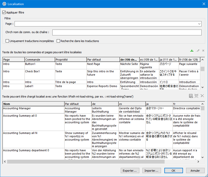 Les lignes de texte localisées sont définies dans le dialogue de localisation (capture d'écran ci-dessous) en ajoutant une colonne pour chaque nouvelle langue et en définissant les lignes de texte dans cette colonne. Pour plus de détails, voir la description de la commande de menu, Projet | Localisation. De plus, les lignes de texte nommées peuvent aussi être localisées et ensuite référencées dans n'importe quel endroit du design en utilisant la fonction d'extension mt-load-string dans une expression XPath : mt-load-string(NameOfString').
