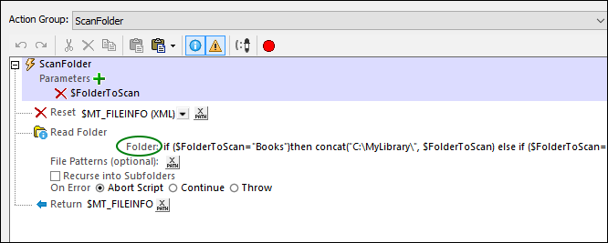 L’exemple de bibliothèque d’action de serveur décrit dans cette rubrique est ServerLibrary.mtd, qui est situé dans le dossier ServerActionLibraries du dossier des Tutoriels. Vous pouvez ouvrir ce fichier server-library et cliquer sur le bouton Groupes d’action pour aller à la définition du Groupe d’action appelé ScanFolder (capture d’écran ci-dessous).