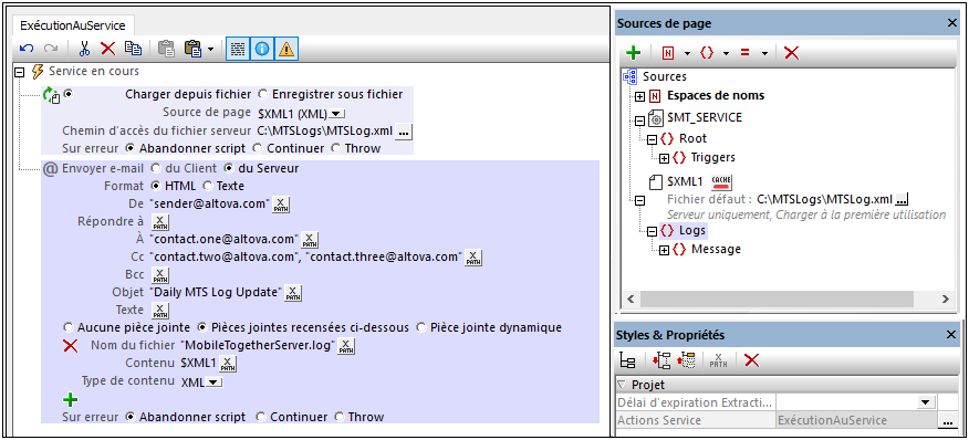 4.La partie gauche du volet de dialogue (pas affiché dans la capture d’écran ci-dessus) affiche les actions disponibles pour les services. Les actions non disponibles sont désactivées (et grisées), Glisser les actions que vous souhaitez exécuter en tant que le service dans l'onglet ExécutionAuService. Ces actions constituent l’Arborescence d’Action de Service. Dans la capture d'écran ci-dessus, deux actions ont été ajoutées : (i) Charger depuis le fichier charge le fichier journal MobileTogether Server à la source de page $XML1, et (ii) Envoyer e-mail envoie des e-mails aux trois destinataires avec l’arborescence $XML1 des journaux MobileTogether Server en annexe.