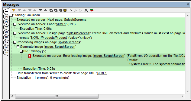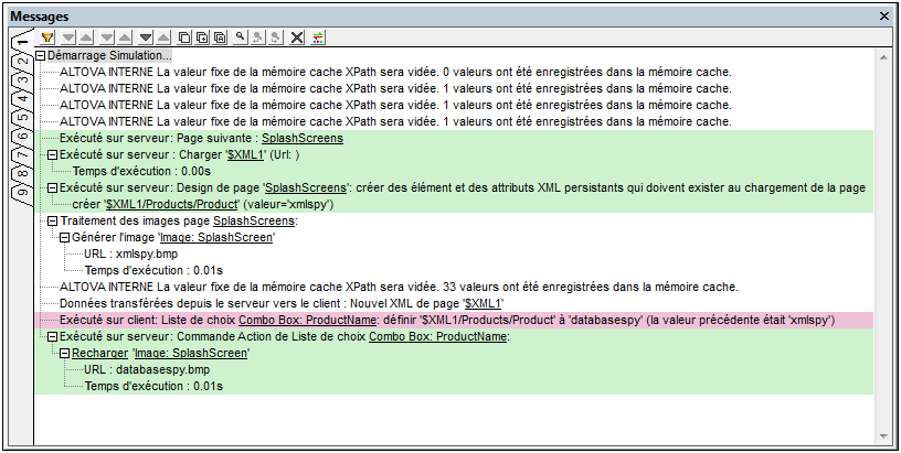 Alors que la simulation progresse, le Volet de messages de l'interface utilisateur de MobileTogether Designer fournit un rapport détaillé et étape par étape de toutes les activités en cours concernant les solutions et le temps nécessaire à chaque action. Vous pouvez clairement voir ce qui se passe à chaque étape de la progression du flux de travail : ce qui est exécuté sur le serveur, sur le client, l'ordre du flux des actions et pourquoi les actions se déroulent de cette manière. Les actions serveur et client sont affichées avec des couleurs d'arrière-plan différentes. Les erreurs sont marquées et des avertissements et des traces sont également affichés. Tous ces éléments sont absolument nécessaires et extrêmement utiles pour le test et le débogage des fichiers de design.