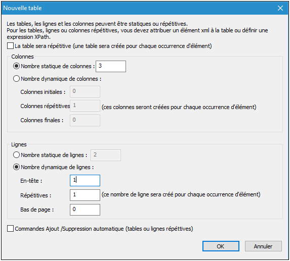 Pour insérer une table possédant les propriétés décrites ci-dessus, ajouter une commande de table contenant les mêmes spécifications que celles montrées dans la capture d'écran ci-dessous.
