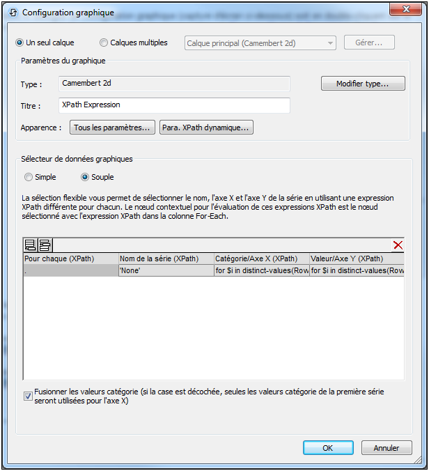 En ce qui concerne les camemberts, il nous faut deux séries (pour les axes X et Y). L'option Souple est idéale pour la définition des axes pour deux séries. Le paramètre For-each sélectionne le nœud actuel (RowSet). Nous définissons les expressions XPath pour les deux axes :