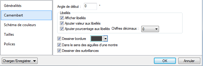 •Dans le dialogue de Configuration de graphique, cliquer Tous les paramètres. Dans le dialogue Changer Apparence qui apparaît, sélectionner Camembert et sélectionner Ajouter valeur aux libellés et Ajouter pour cent aux libellés.
