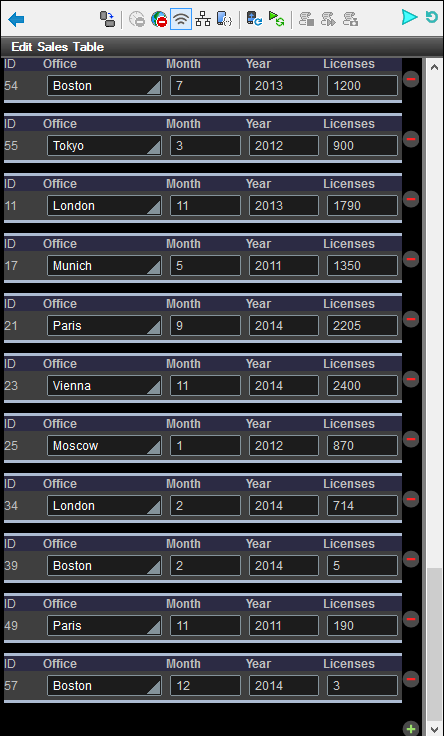 La table Edit Sales, comme la table Edit Offices, a été créée sur une page de niveau supérieur séparée. Lorsque la solution est exécutée, cette page est accessible depuis la page principale (capture d'écran en-dessous à gauche). Cliquer sur le bouton Edit Sales Table pour charger la table Edit Sales (capture d'écran en-dessous à droite). La table Sales a plusieurs lignes, chacune d'entre elles contient une colonne d'ID (éléments de ventes) non-éditable, des colonnes Office, Month, Year, Licenses éditables et une commande Supprimer (capture d'écran en-dessous à droite). De plus, vous trouverez une commande d'ajout de ligne en-dessous de la dernière ligne, un bouton Soumettre dans la barre Edit Sales Table et un bouton Retour pour retourner à la page précédente (la page principale, dans ce cas).