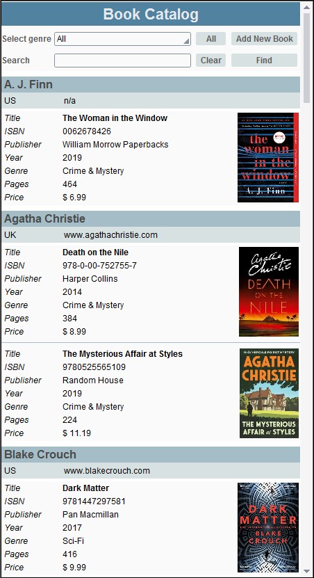 •Afficher chaque auteur dans la BD, ensemble avec des informations sur tous les livres de l’auteur. Par exemple, vous verrez dans la capture d’écran que Agatha Christie est recensée avec des informations sur sa personne (de la table des Authors) et des informations sur les deux livres dans le catalogue (de la table des Books).