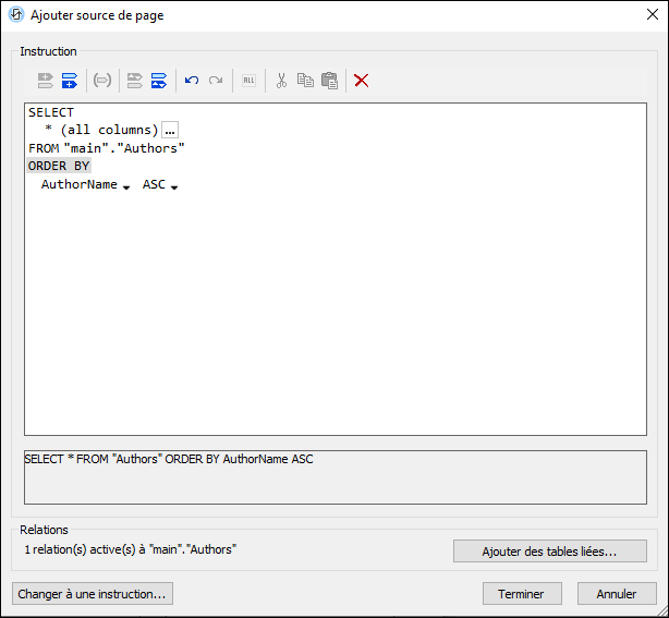 3.Dans le prochain dialogue (capture d’écran ci-dessous gauche), ajoutez une instruction Order By et triez les enregistrements des Auteurs par AuthorName, puis cliquez sur Ajouter les tables associées.