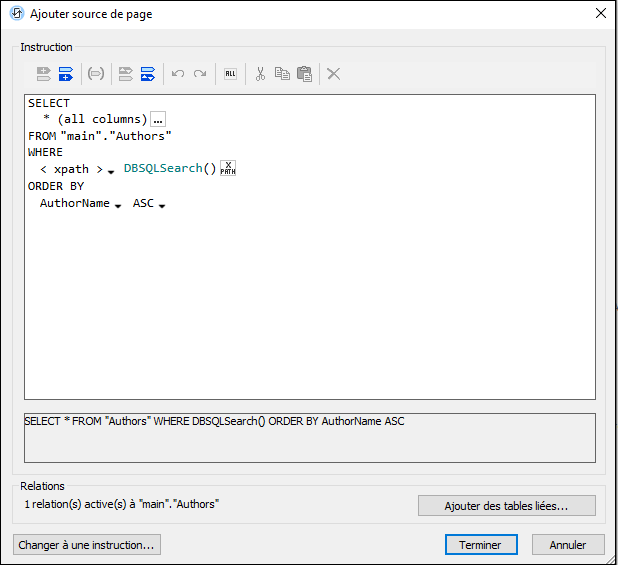 La source de page $BookCatalog a été configurée pour sélectionner tous les enregistrements de la table des Authors à l’origine, avec chaque enregistrement Authors contenant les enregistrements Books associés comme enfants. Maintenant, nous ajoutons une clause WHERE à l’instruction SQL afin de filtrer les enregistrements Authors pour sélectionner uniquement ces enregistrements où le terme de recherche apparaît. Puisque la clause WHERE doit être construite avec une expression XPath complexe, nous utiliserons une fonction pour mettre en œuvre l’expression XPath. La fonction est appelée DBSQLSearch(), tel qu’affichée dans la capture d’écran ci-dessous. Dans la capture d’écran, vous pouvez lire le instruction SQL dans le volet à côté du bas de la fenêtre. Dans cette instruction SQL, la clause WHERE sera la valeur envoyée de la fonction DBSQLSearch().