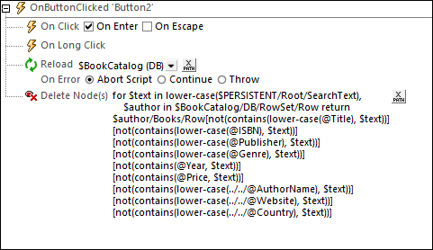 La recherche est lancée quand on clique sur le bouton Find. Les actions de l’événement OnClicked du bouton (capture d’écran ci-dessous) sont (i) une action Recharger de la source de page $BookCatalog et (ii) une action Supprimer Noœuds). Les deux actions actions sont décrites en détail ci-dessous. Pour le moment, il est important de savoir que l’action Recharger pour la source de page $BookCatalog commence la recherche dans la BD. Voir la prochaine section, Recherche SQL de la BD. L’action Supprimer Nœud(s) est décrite dans la section Supprimer des livres sans correspondance ci-dessous