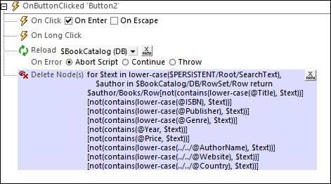 3.En cliquant sur le bouton Find, deux actions sont exécutées en séquence : (i) la source de page $BookCatalog est rechargée avec uniquement les enregistrements de ces Authors qui contiennent le string de recherche dans les données soit de l’auteur, soit de tout livre enfant (voir le Point 4 ci-dessous); (ii) une action Supprimer Nœud(s) supprime ces livres (des auteurs sélectionnés) qui ne contiennent pas de string de recherche dans ses champs, ne laissant que les livres de cet auteur qui contiennent le string de recherche (voir le Point 5 ci-dessous).