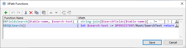 Pour la recherche, nous créons deux fonctions : DBSQLSearch() et DBFieldsSearch(). Le dialogue Fonctions XPath pour créer ces fonctions est accédé par le biais de la commande de menu Projet | Fonctions XPath/XQuery et il est affiché dans la capture d’écran ci-dessous.