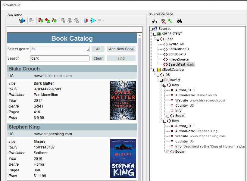 4.La recharge de la source de page déclenche une recherche dans la BD pour le string de recherche par le biais d’une instruction SQL. En conséquence, la source de page $BookCatalog sera rechargée avec uniquement les auteurs pertinents (là où le string de recherche apparaît, soit dans les données de l’auteur, soit dans les données d’au moins un des livres de l’auteur). Voir la section Recherche SQL de la BD ci-dessous pour plus de détails.