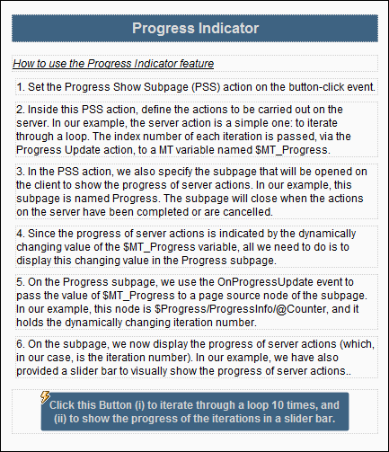 Ajoutez maintenant une action Progress Update comme enfant de l’action Loop. Ceci fera que l’action Progress Update est exécutée une fois au sein de chaque itération. De manière plus importante, l’action Progress Update envoie une valeur, par le biais de son paramètre Valeur, à la variable dynamique $MT_Progress. Dans notre exemple, nous saisissons une expression XPath $loop, sleep(1000) (trouvée dans la capture d’écran ci-dessus) comme paramètre Value. Cette expression fait que, lors de chaque itération, le nombre index de l’itération actuelle est passé à $MT_Progress. En conséquence, lorsque les itérations se poursuivent, la valeur dans $MT_Progress changera de 1 à 10 jusqu’à ce que les itérations aient été achevées. (La fonction XPath sleep() pause l’itération pour la durée de 1 seconde, qui ralentira l’indicateur de progrès sur la sous-page, assez lentement pour que nous puissions observer le progrès.) Lorsque toutes les itérations ont été complétées, la boucle est quittée et l’action Progress Show Subpage est terminée - ce qui cause la fermeture de la sous-page.