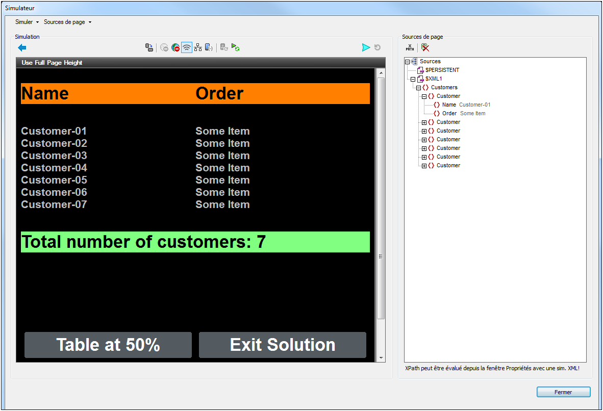 •ScrollableTables-01.xml: il s'agit d'un fichier XML qui contient une base de données de clientèle simple et brève. Elle contient sept entrées clients. Vous pouvez voir la structure du fichier dans l'Arborescence $XML1 dans la capture d'écran ci-dessus.