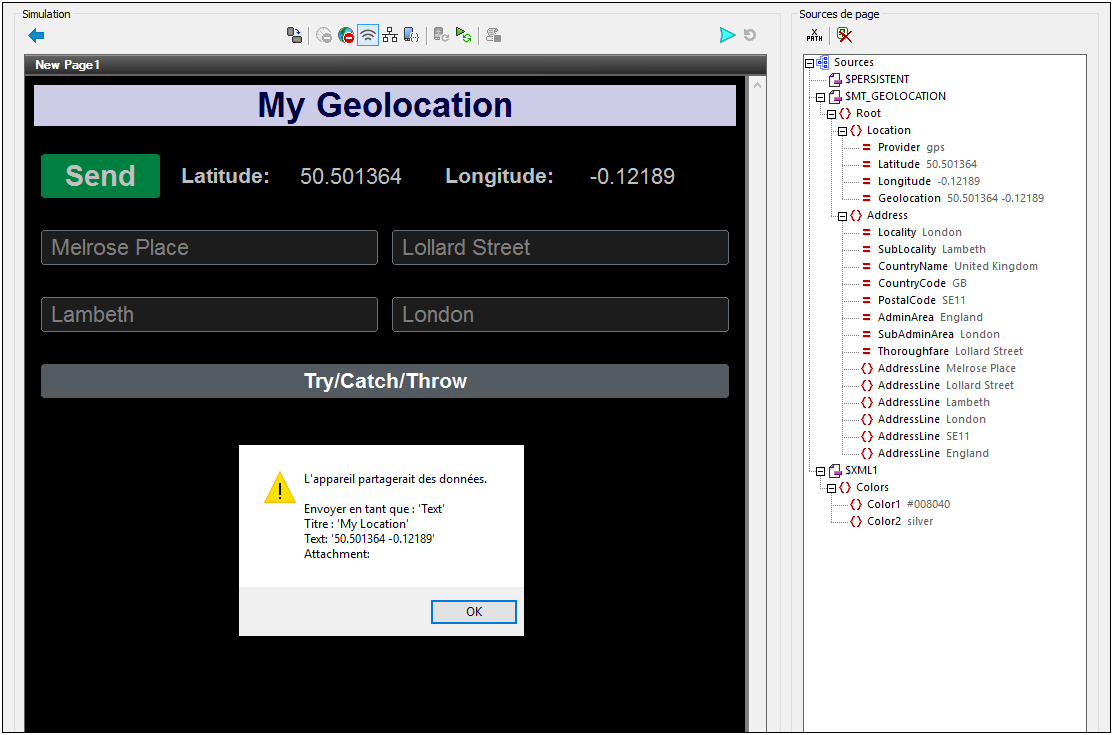 •Send : Lance la fonction de suivi de la géolocalisation de l'appareil, écrit les données de géolocalisation dans l'arborescence $MT_GEOLOCATION, affiche les items de géolocalisation principaux dans la solution et ouvre le menu Partage de l'appareil mobile.