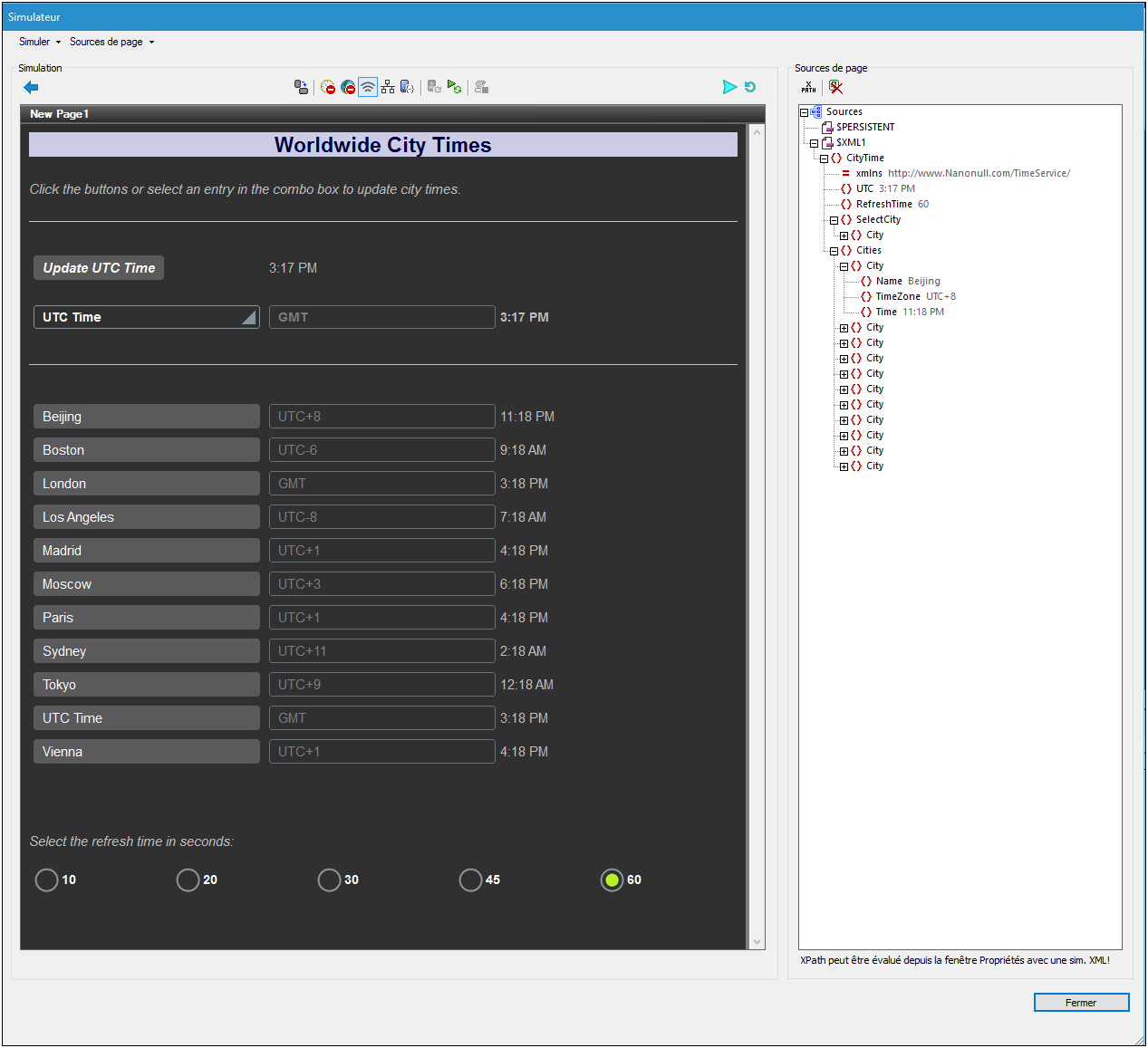 Appuyer sur F5 pour exécuter une simulation dans MobileTogether Designer. Le minuteur pour l'actualisation de la page sera démarré avec une valeur obtenue dans le nœud $XML1/CityTime/RefreshTime. Il s'agit de 60 (secondes) dans l'arborescence de données originale.