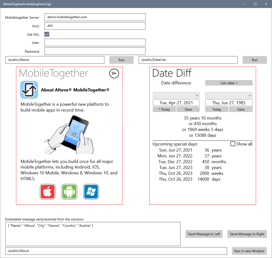 Vous pouvez intégrer les solutions MobileTogether dans les applis Universal Windows Platform (UWP). Chaque solution MobileTogether est placée dans une appli UWP par le biais du contrôle SolutionView, qu'Altova a introduit spécialement à cette fin. Par exemple, la capture d'écran ci-dessous affiche la fenêtre d'une appli UWP qui contient deux contrôles SolutionView (encadré en rouge), dont chacun affiche une solution MobileTogether. Chaque appli UWP peut intégrer plus d'une solution (telle que dans la capture d'écran ci-dessous), dont chacune peut être exécutée en même temps. De plus, l'appli UWP peut démarrer une solution dans une nouvelle fenêtre UWP.