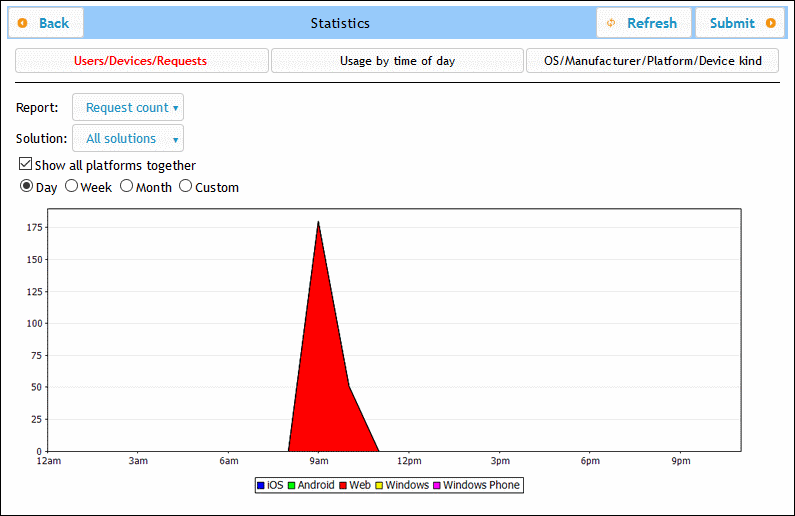 Les statistiques de l'utilisation de solution peuvent être consultées dans la solution Statistics, qui est située par défaut dans le conteneur /admin. La solution Statistics affiche une variété de statistiques concernant des solutions individuelles pour une période sélectionnée par l'utilisateur. Une variété de filtres sont disponibles, qui vous permettent de consulter les données d'utilisation en tant que le nombre d'utilisateurs, le type d'appareils ou de SE, les pointes d'utilisation, etc.