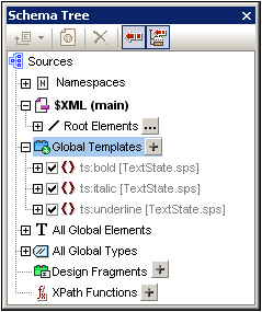 A global template can be activated by checking its entry in the global templates listing in the Schema Tree sidebar. It can be deactivated by unchecking the entry. If a global template has been activated (the default setting when the global template was created ), it is generated in the XSLT stylesheet. If it has been deactivated, it is not generated in the XSLT stylesheet but is still saved in the SPS design.