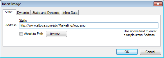 The image URI is entered directly in the Address field (see screenshot below). In the screenshot below the image URI is: https://www.altova.com/pix/Marketing/logo.png.