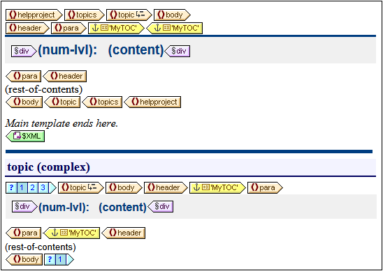 In the content model represented by the screenshot above, topic is a recursive element, that is, a topic element can itself contain a descendant topic element. In the main template (the end of which is indicated by the tag_closemaintemplates tag), a level has been set on the first level of topic tag_TOCLevelOnTemplate. The rest-of-contents instruction in the main template specifies that templates will be applied for all child elements of topic/body except header. This means that the global template for topic children of topic/body will be processed.