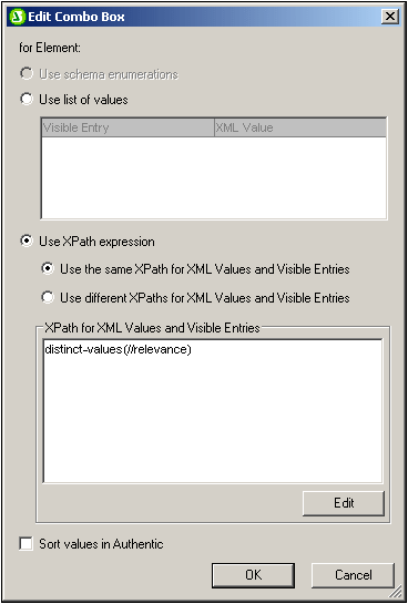 3.In the Edit Combo Box that pops up, modify the XPath expression from distinct-values(//relevance) to distinct-values(//relevance), 'All'. This adds the string All to the sequence of items returned by the XPath expression.