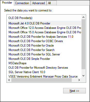 Microsoft Access | •Microsoft Office Access Database Engine OLE DB Provider (recommended) •Microsoft Jet OLE DB Provider